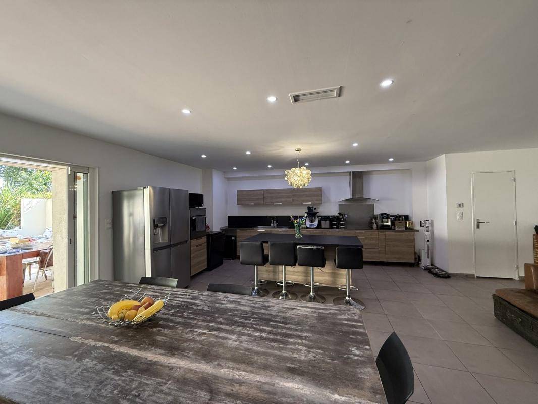 Grand salon baigné de lumière avec cuisine aménagée et équipée