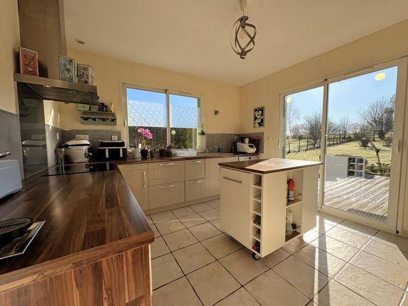 La cuisine indépendante, moderne et fonctionnelle, dispose d’un accès direct sur l’extérieur : pratique pour les repas d’été et le quotidien. Côté nuit, la maison compte 5 chambres, dont trois en rez-de-chaussée, permettant une vie de plain-pied, idéale pour l’accueil d’amis ou de la famille. Une grande salle de bain avec baignoire, double vasque et douche, ainsi qu’un WC indépendant complètent le confort familial.