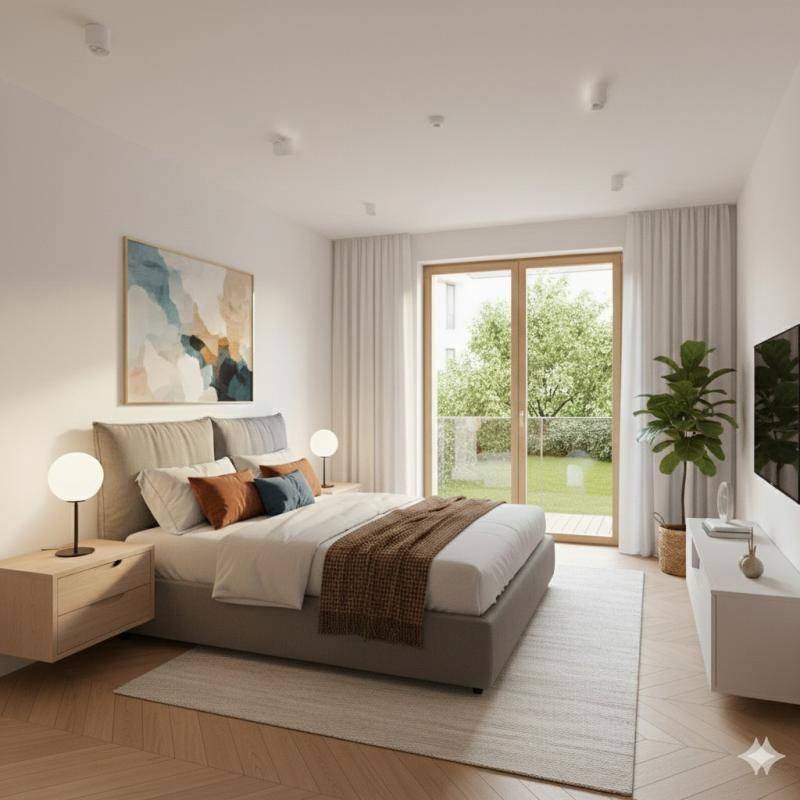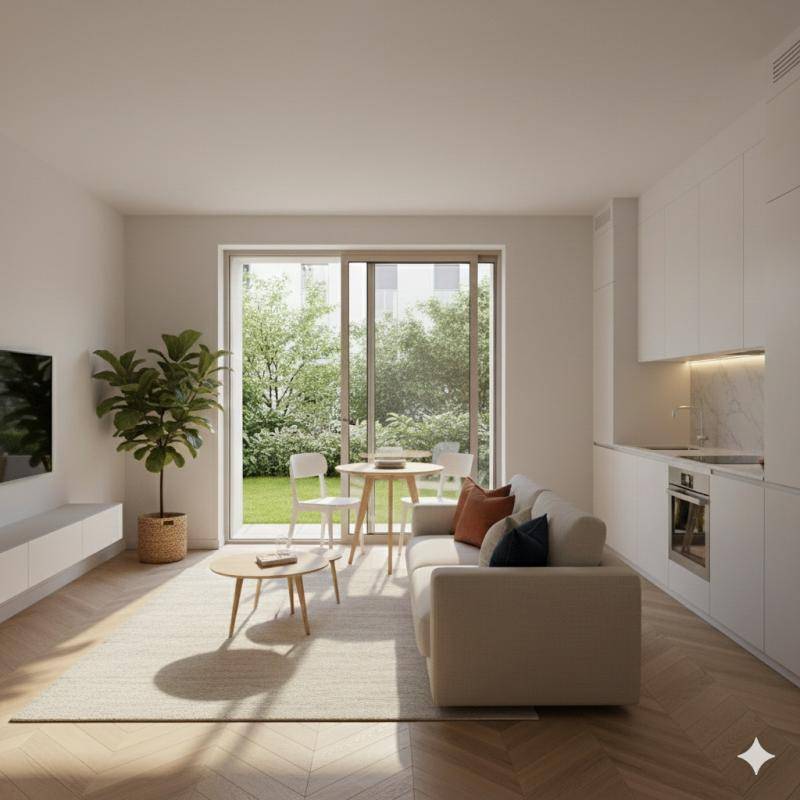 L’appartement se compose d’un séjour avec cuisine ouverte, lumineux et fonctionnel, donnant directement accès à la terrasse et au jardin.