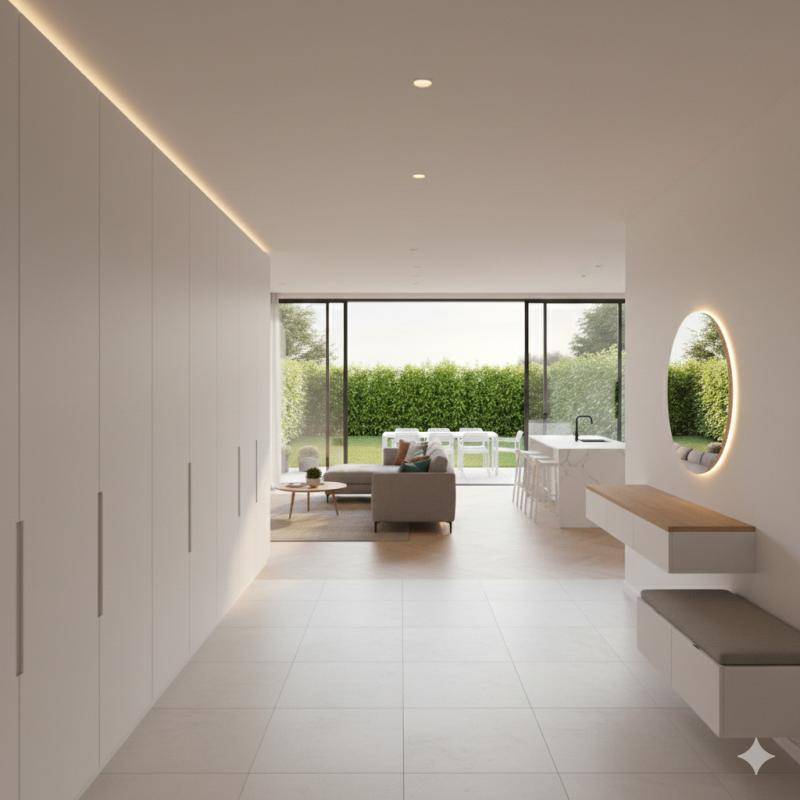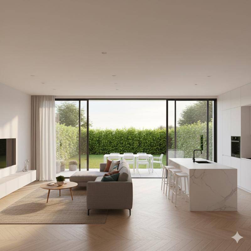 La pièce de vie avec cuisine ouverte s’ouvre largement sur la terrasse et le jardin, créant une continuité naturelle entre intérieur et extérieur.