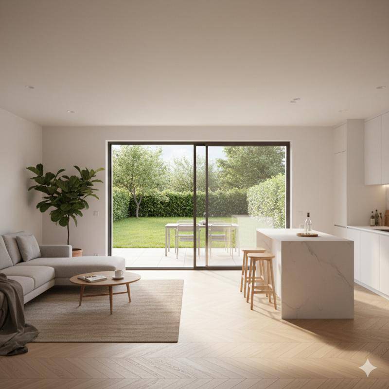 La pièce de vie avec cuisine ouverte séduit par son agencement fonctionnel et ses larges ouvertures sur la terrasse et le jardin, créant une continuité intérieur-extérieur idéale.
