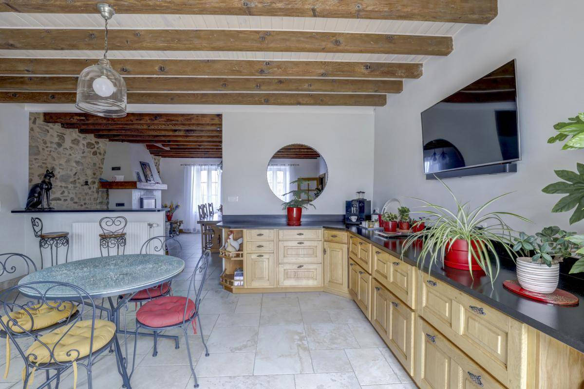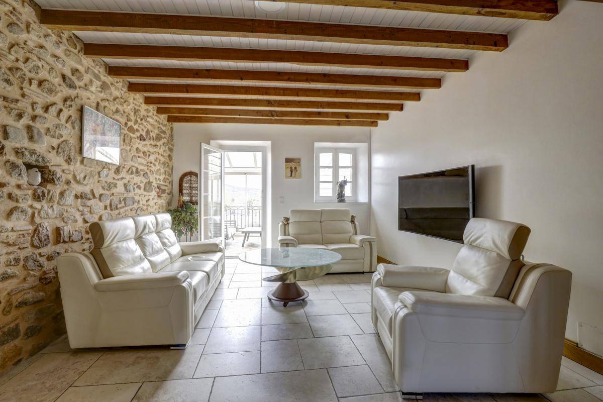 – Un vaste séjour lumineux et un salon chaleureux, sublimés par les murs en pierre et les poutres.