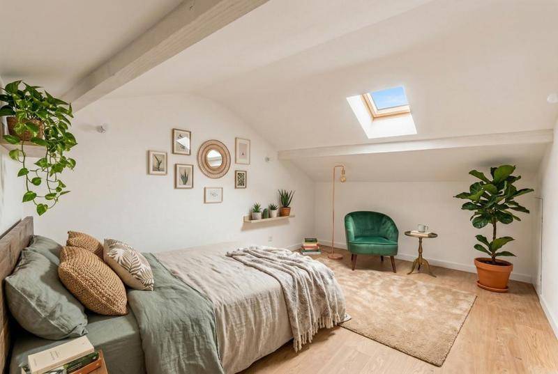Dès l’entrée, le charme opère : poutres apparentes, parquet et matériaux soigneusement choisis créent une atmosphère accueillante.