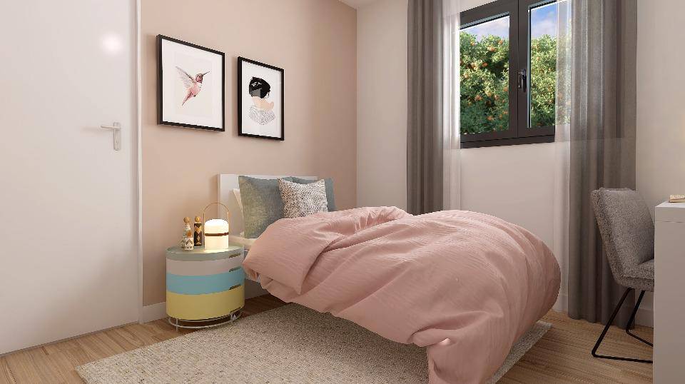 Cette maison dispose de quatre chambres, d’un espace de vie ouvert et lumineux, d’une salle de bains, d’un garage intégré de 15 m² avec un cellier attenant.