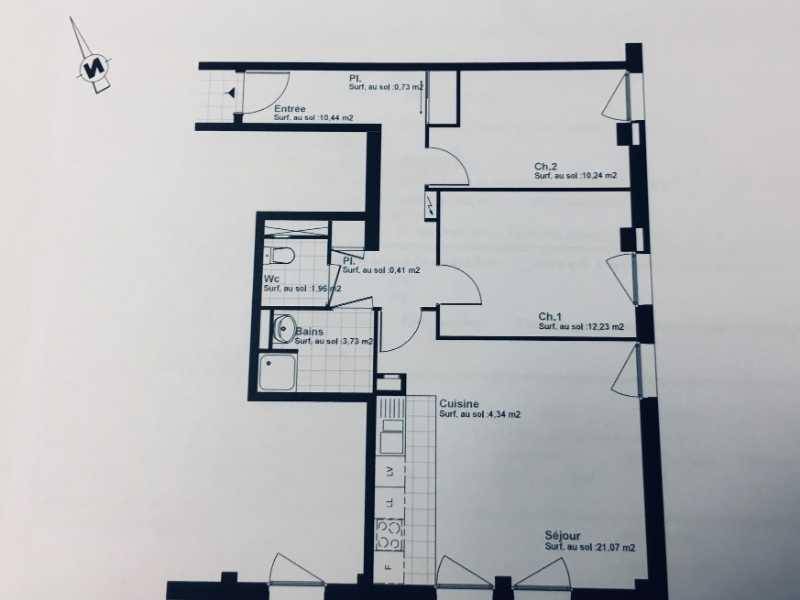 Cet appartement de 65m2 au 5ème étage avec ascenseur se compose d’une entrée avec placard, une pièce de vie avec cuisine ouverte de 26m2, 2 chambres de 10 et 12m2, une SDB avec douche et un WC séparé.
