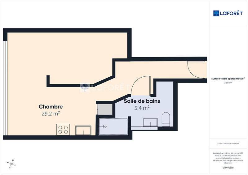 Le logement se compose d’une pièce principale lumineuse avec coin cuisine aménagé et équipé, ainsi que d’une salle d’eau moderne avec douche et WC.