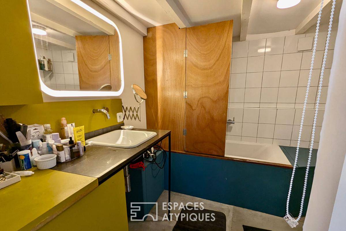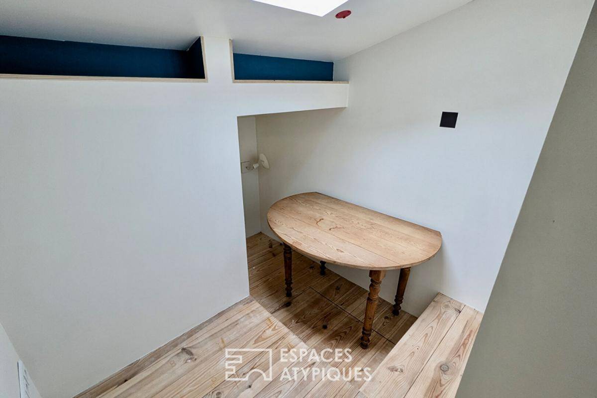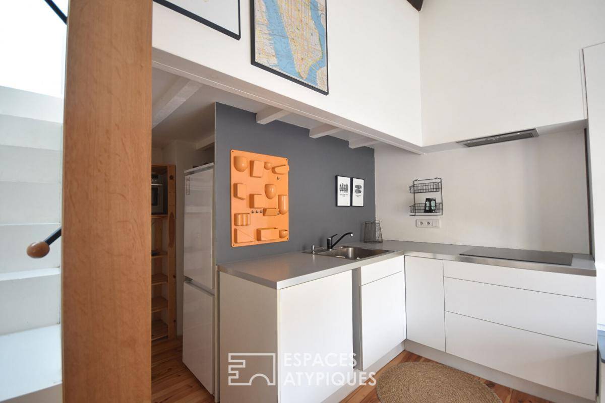 L’entrée se fait par une spacieuse pièce de vie avec de belles hauteurs sous plafond. Séparées par une étagère sur mesure, la partie salon et la partie cuisine se font face. Ce premier niveau est complété par une jolie salle de bain et une arrière cuisine.