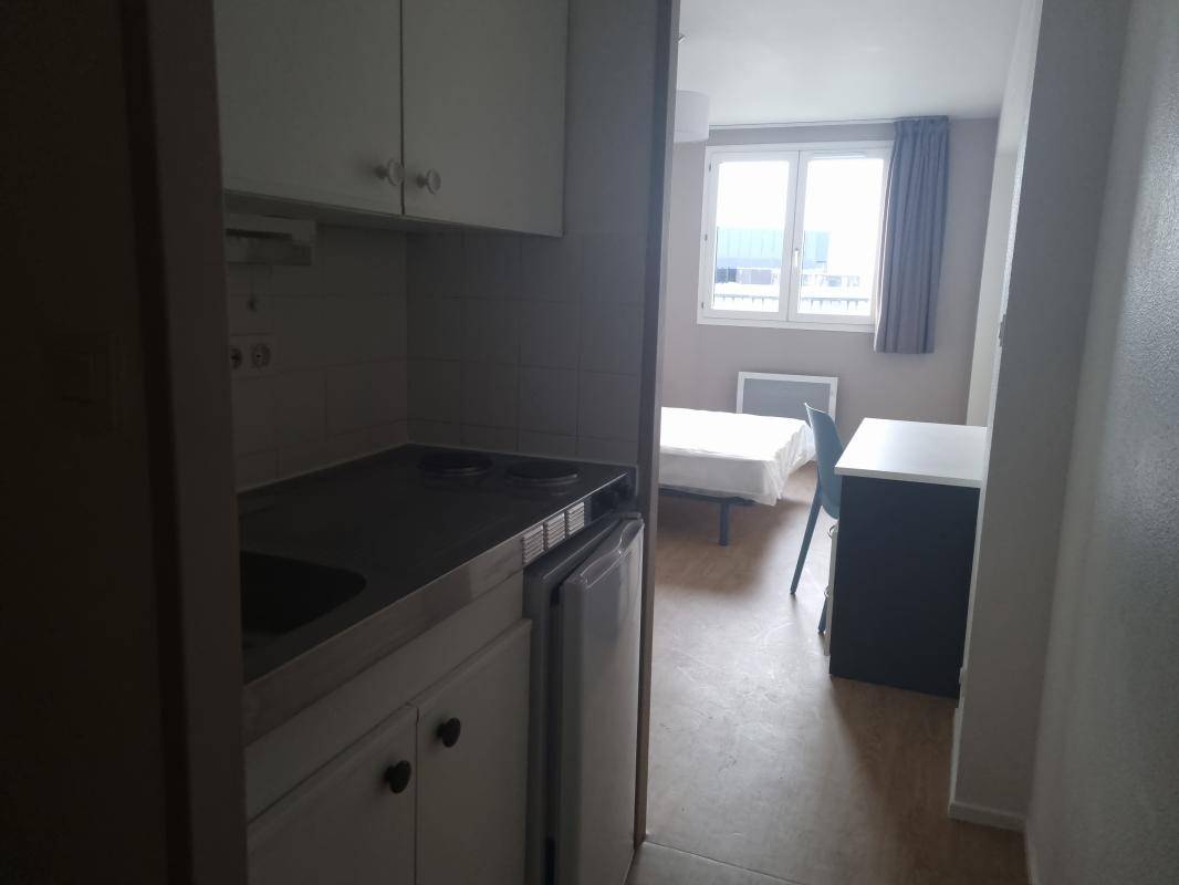 Équipements du logement : lit en 140, plan de travail, rangement, kitchenette avec réfrigérateur et plaques électriques et balcon