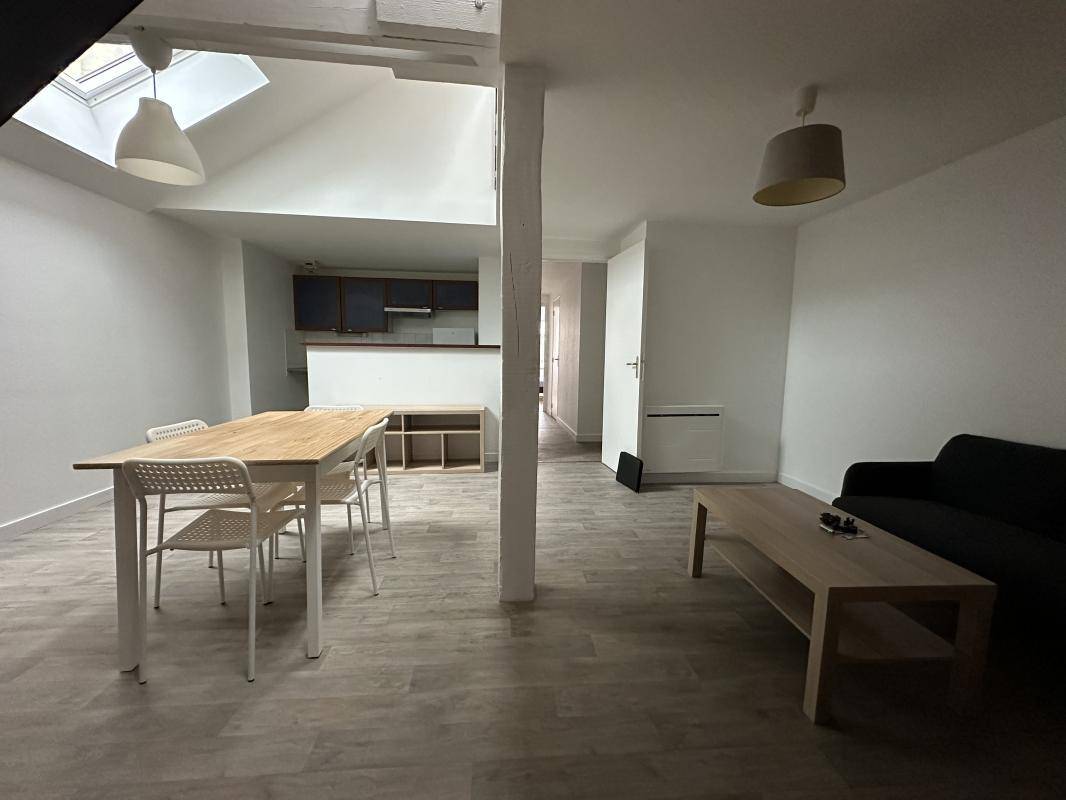 Un appartement T5 MEUBLE comprenant une entrée avec placards, un WC indépendant, une pièce de vie avec un espace en mezzanine et coin cuisine, un premier dégagement menant à une très grande chambre de 19m² avec placard et une salle d’eau, un deuxième dégagement menant à une salle de bains, et deux chambres, chacune avec placards.