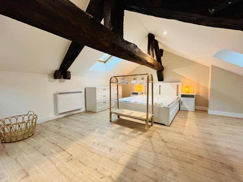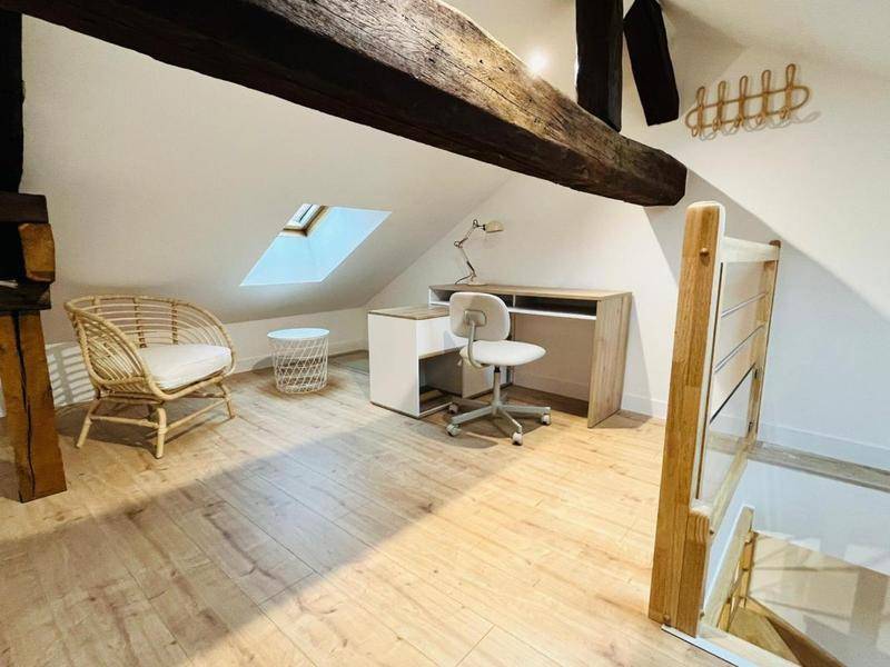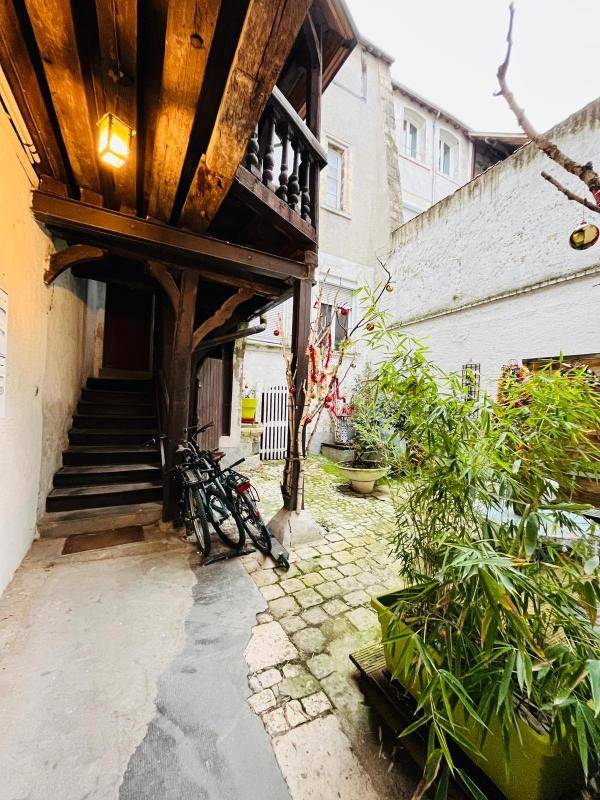 ORLEANS, HYPERCENTRE, 7 RUE DES TROIS MARIES, F2 MEUBLE EN DUPLEX de 41.06m2 (62.27m2 AU SOL) ENTIEREMENT RENOVÉ comprenant entrée, pièce principale avec parquet, grande cuisine ouverte aménagée et équipée d’un frigo, plaques de cuisson, four, hotte, lave-vaisselle, salle d’eau + WC et Machine à laver. A l’étage : Grande chambre sous comble lumineuse avec bureau et rangements. Vous disposerez d’une cour commune et d’une partie de cave. Chauffage individuel électrique. Logement entièrement isolé et rénové, A VISITER SANS TARDER. Localication idéale, au calme au coeur de ville, proche toutes commodités et transports.