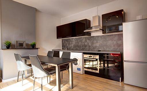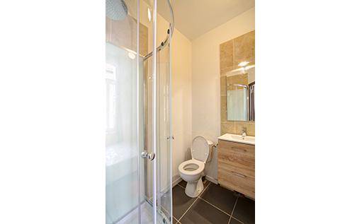 Vous profitez d un lit double confortable avec une télévision connectée et une salle de bain privative comprenant douche vasque et WC le logement dispose de belles parties communes de 20 m2 avec cuisine équipée four micro ondes lave linge et salon chaleureux