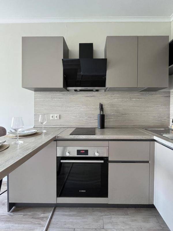 Cuisine : Cuisine ouverte sur le séjour, séparée par une table bar, entièrement équipée avec un réfrigérateur, un four, une hotte, des plaques de cuisson, un lave-vaisselle et de nombreux rangements.