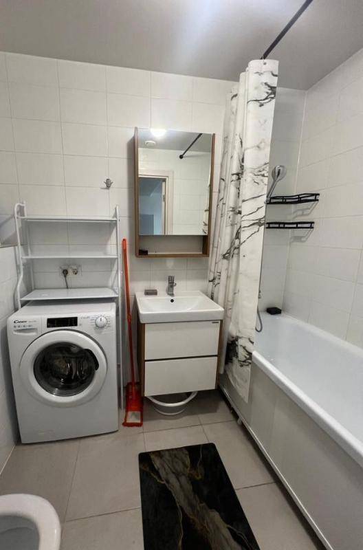 La salle de bain comprend une baignoire, une machine à laver, une vasque avec meuble de rangement, et des équipements récents.