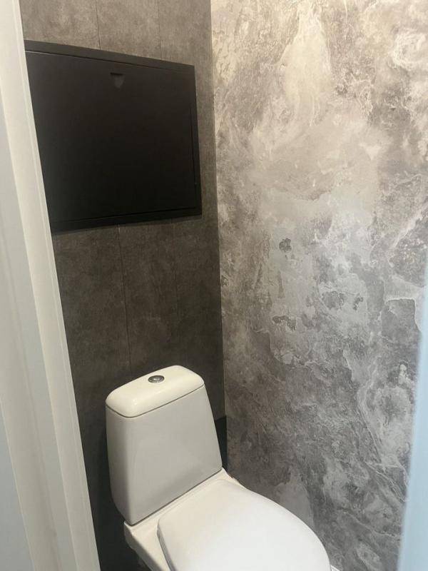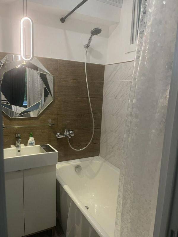 La salle de bain dispose d’une baignoire, d’un meuble vasque et d’un miroir original , avec des finitions soignées. Les WC sont séparés.