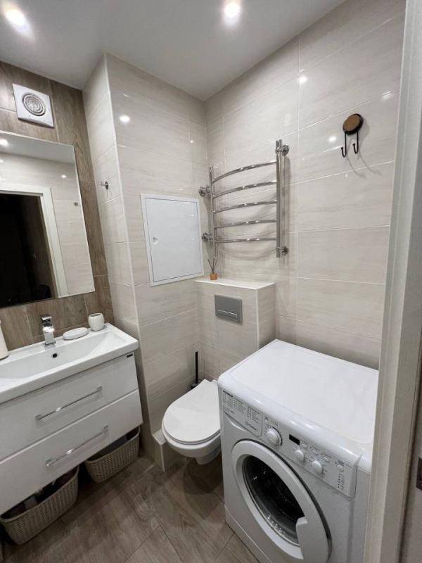 La salle de bain moderne comprend une baignoire, une vasque avec meuble, un sèche-serviettes et une machine à laver.