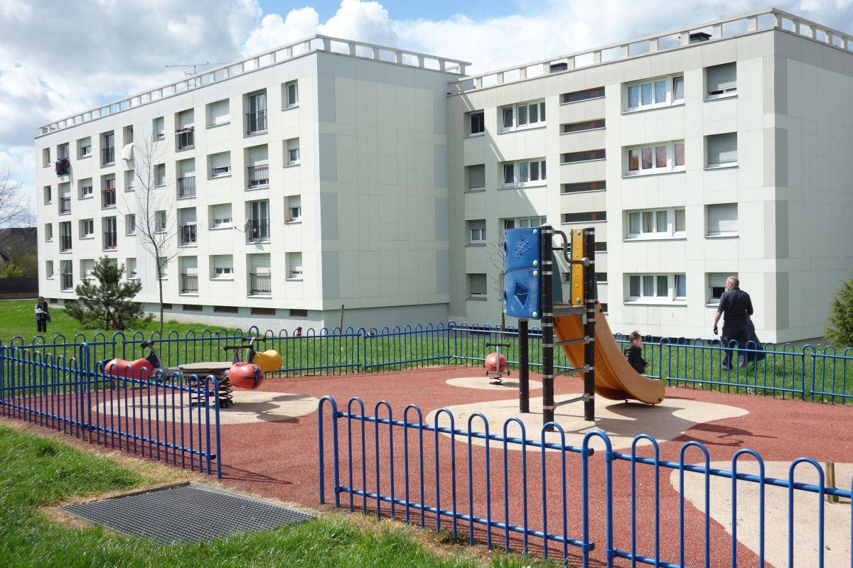 Vue sur le parc de jeu depuis votre séjour ,parking devant l’immeuble.